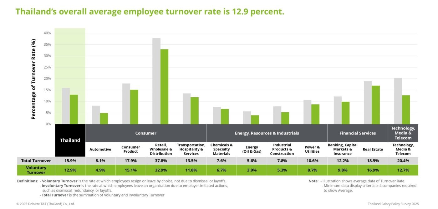 การสํารวจพบว่าอัตราการลาออกโดยสมัครใจโดยเฉลี่ยโดยรวมของประเทศไทยอยู่ที่ร้อยละ 12.9 โดยมีความแตกต่างในแต่ละกลุ่มอุตสาหกรรม อุตสาหกรรมที่มีอัตราการหมุนเวียนสูงสุด ได้แก่ ค้าปลีกที่ร้อยละ 32.9 อสังหาริมทรัพย์ที่ร้อยละ 16.9 และสินค้าอุปโภคบริโภคที่ร้อยละ 15.1 ในทางกลับกัน อัตราการหมุนเวียนล่าสุดพบในพลังงาน น้ำมัน และก๊าซที่ร้อยละ 3.9 ยานยนต์ที่ร้อยละ 4.9 และภาคอุตสาหกรรมที่ร้อยละ 5.3
