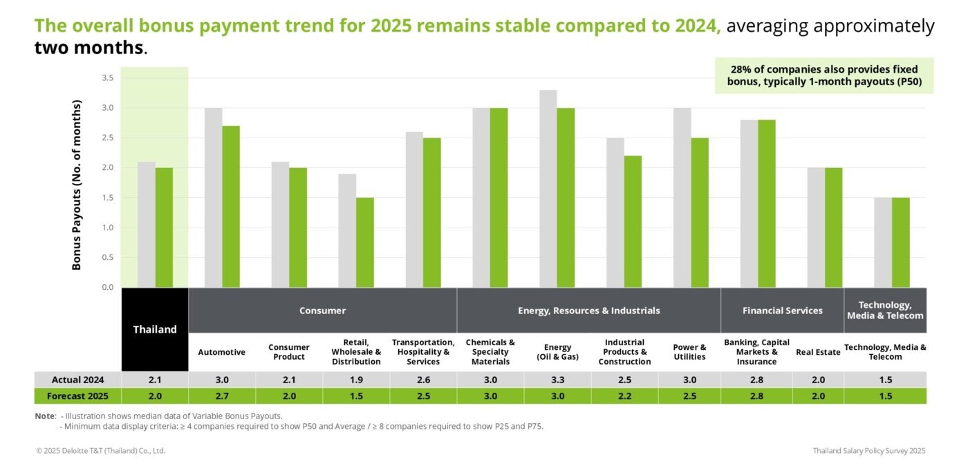 ในส่วนของโบนัสผันแปร การสํารวจแสดงให้เห็นว่าแนวโน้มการชําระเงินโดยรวมสำหรับปี 2568 ยังคงทรงตัวเมื่อเทียบกับปี 2567 โดยเฉลี่ยประมาณสองเดือน อุตสาหกรรมที่มีการจ่ายโบนัสสูงสุดในปี 2568 ได้แก่ เคมีภัณฑ์ พลังงาน และน้ำมันและก๊าซ ซึ่งจ่ายประมาณสามเดือน ในขณะที่อุตสาหกรรมที่มีระดับโบนัสต่ำกว่า ได้แก่ เทคโนโลยีและการค้าปลีก โดยมีการจ่ายโบนัสประมาณ 1.5 เดือน นอกจากนี้ ประมาณร้อยละ 28 ขององค์กรไทยยังคงให้โบนัสคงที่เพิ่มเติมอีก 1 เดือน