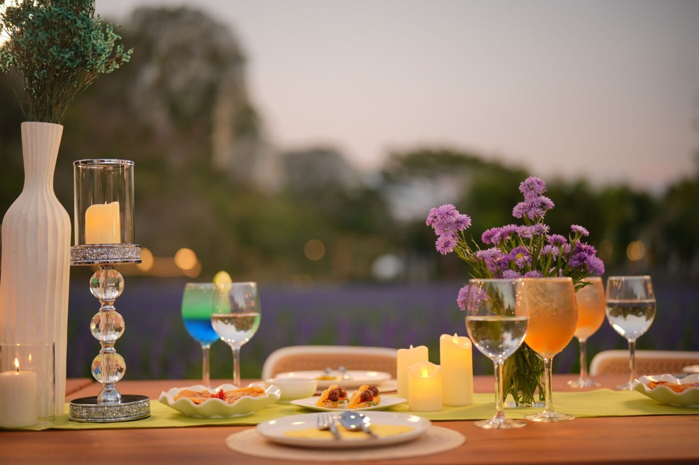 นอกจากภาพความสวยงามของดอกบลูซัลเวียที่สร้างความตื่นตาตื่นใจ ที่ให้ความรู้สึกเหมือนได้เข้าไปอยู่ในแคว้นพรอว็องส์แล้ว อีกหนึ่งไฮไลท์ที่พลาดไม่ได้ คือ การดินเนอร์ใต้แสงเทียนท่ามกลางทุ่งดอกไม้ในบรรยากาศสุดโรแมนติก “Romantic Provence Candle Light Dinner” กับเมนูอาหารไทยที่เตรียมไว้เฉพาะ 3 วันเท่านั้นคือ วันศุกร์–วันเสาร์–วันอาทิตย์ ตั้งแต่เดือนมกราคม ต่อเนื่องถึง เดือนกุมภาพันธ์ 2569 นี้ และไม่ได้จำกัดเฉพาะเพียงคู่รัก แต่ยังรวมถึงครอบครัว และผู้ที่ต้องการสัมผัสประสบการณ์มื้อค่ำท่ามกลางธรรมชาติ แสงเทียน กับโต๊ะดินเนอร์ยาวที่เปิดรับวิวทุ่งดอกไม้แบบ 360 องศา นั่นเพราะทุ่งสิริสมัยมองว่าความรักเป็นสิ่งสวยงามที่ไม่ได้ตีกรอบเฉพาะคู่รักเพียงอย่างเดียว