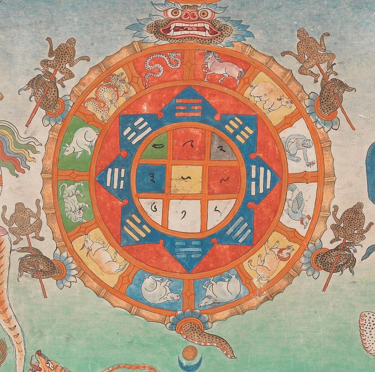 ซึ่งนี่ไม่ใช่ความบังเอิญที่ผังนี้คล้ายกับผังฮวงจุ้ยเกือบ 100% แต่คือตารางผัง 9 ช่อง “ผังหล่อซู” ที่เป็นต้นกำเนิดของวิชาฮวงจุ้ยที่เรียกว่า วิชาดาวเก้ายุค และทั้งสองระบบกำลังอธิบายกฎเดียวกัน ระบบหนึ่งเรียกมันว่า สังสารวัฏ (วงจรแห่งกรรม) อีกระบบเรียกมันว่า พลังชี่ (พลังงานที่หมุนเวียน) โดยแก่นแท้ของ คือ “การไหลเวียนที่ไม่หยุดนิ่ง” และที่ซ่อนอยู่ในภาพนี้ คือรหัสตัวเลขที่เชื่อมสองโลกเข้าด้วยกันนั่นคือ ตัวเลข 108