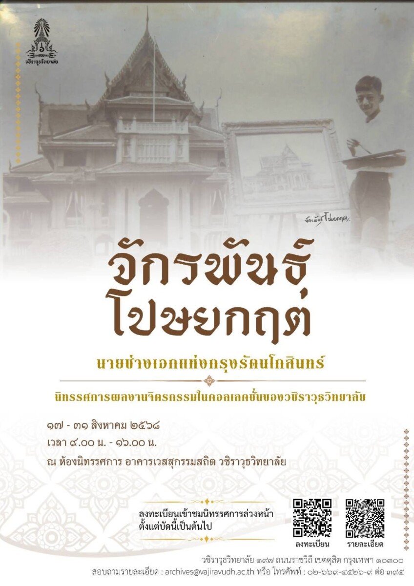 ระหว่างวันที่ ๑๗-๓๑ สิงหาคม พ.ศ.๒๕๖๘ เวลา ๙.๐๐-๑๖.๐๐ น. จัดแสดงผลงานด้านจิตรกรรม ซึ่งมีสายเส้น ลวดลาย สีสัน ฝีแปรง อันเกิดจากฝีมืออันประณีต ของอาจารย์จักรพันธุ์ โปษยกฤต ที่สวยและงดงามมากจนต้องตะลึง