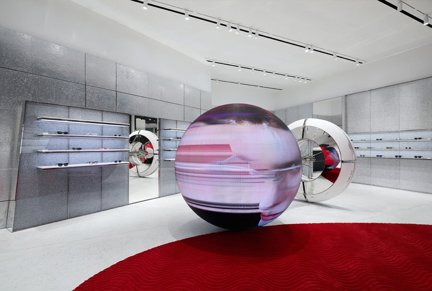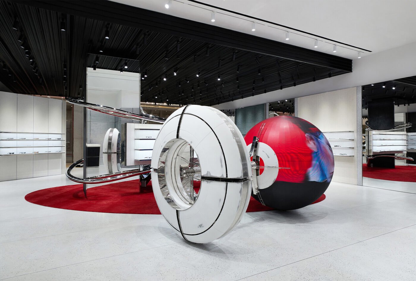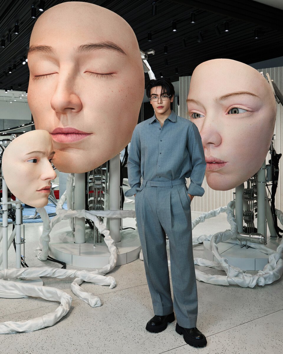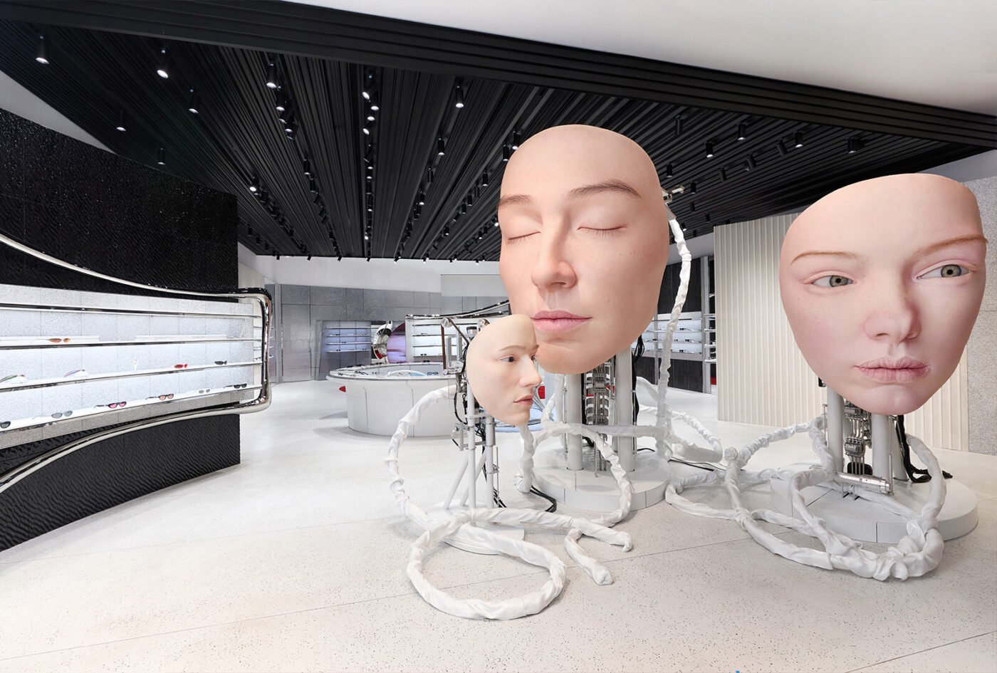 โดยพื้นที่โลกเสมือนอันเป็นเอกลักษณ์เฉพาะตัวของแบรนด์ GENTLE MONSTER ถูกถ่ายทอดผ่านการดีไซน์ร้านที่หลอมรวมแฟชั่น ศิลปะ และเทคโนโลยีได้อย่างกลมกลืน กลายเป็น Art Installation Space แห่งการจัดแสดงงานร่วมสมัยแบบ Avant-Garde (อาวองการ์ด) เชื่อมโยงผู้คนเข้ากับแนวคิดนอกกรอบ ให้ได้สำรวจความแปลกใหม่โดยไร้ขีดจำกัด และมีไฮไลต์ คือ Giant Head Kinetic Objects หุ่นยนต์ศีรษะขนาดใหญ่สามชิ้น สามารถเคลื่อนไหวได้อย่างทรงพลัง จึงเป็นจุดสนใจที่สะกดทุกสายตา พร้อมกระตุ้นให้เกิดคำถามเกี่ยวกับความสัมพันธ์ระหว่างมนุษย์กับเครื่องจักรกลในอนาคต