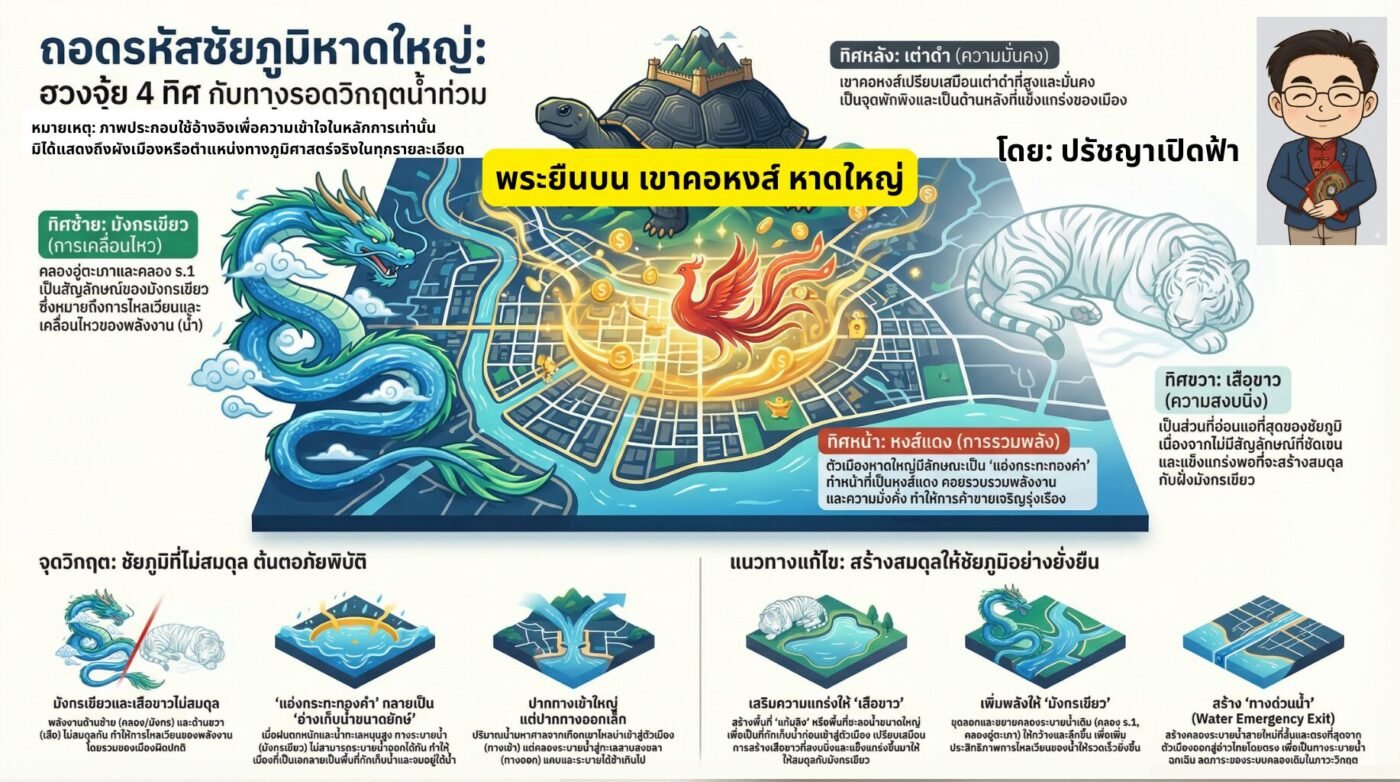 ตัวเมืองหาดใหญ่ตั้งอยู่ในชัยภูมิแบบ “ท้องกระทะ” ซึ่งในทางฮวงจุ้ยถือเป็น “แอ่งกระทะทองคำ” ที่ดึงดูดความมั่งคั่ง (ธาตุน้ำ) เข้าสู่เมือง แต่ในทางกลับกัน เมื่อน้ำไหลหลั่งเกินขีดจำกัด แอ่งนี้จะกลายสภาพเป็น “อ่างเก็บน้ำขนาดยักษ์” ทันที ด้วยระดับความสูงจากน้ำทะเลเพียง 4-8 เมตร ทำให้น้ำขังและระบายออกยากลำบาก