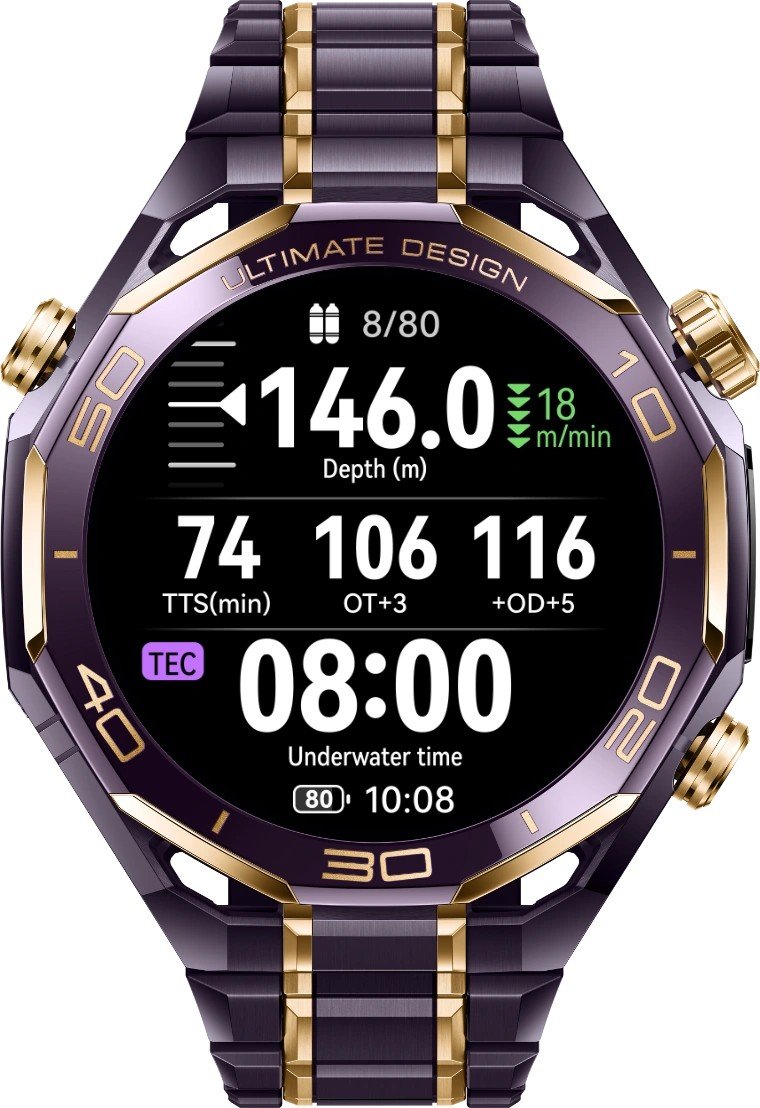 สำหรับ HUAWEI WATCH ULTIMATE DESIGN Royal Gold นั้นมุ่งสู่ความเป็นที่สุดด้วยดีไซน์หรูหรากับหน้าปัดขอบเซรามิกสีม่วงที่ทำจากแร่หายาก (Rare-earth) ตัดกับทองคำ 18K ตัวเรือนทำจากโลหะเหลว (Liquid Metal) ที่แข็งแกร่งทนทาน รองรับการดำน้ำลึกได้สูงสุด 150 เมตร สื่อสารใต้น้ำได้ผ่านคลื่นโซนาร์ ดูแลสุภาพแม่นยำระดับโปรด้วย Multi-sensing X-TAP Technology ทั้งยังมอบประสบการณ์การใช้งานอย่างอิสระด้วย eSIM ตอบโจทย์ไลฟ์สไตล์ที่สมาร์ทอย่างเหนือระดับ บรรทัดฐานใหม่แห่งดีไซน์สมาร์ทวอทช์ระดับไฮเอนด์ พิถีพิถันด้วยวัสดุที่ทนทานทั้งตัวเรือนและหน้าปัด