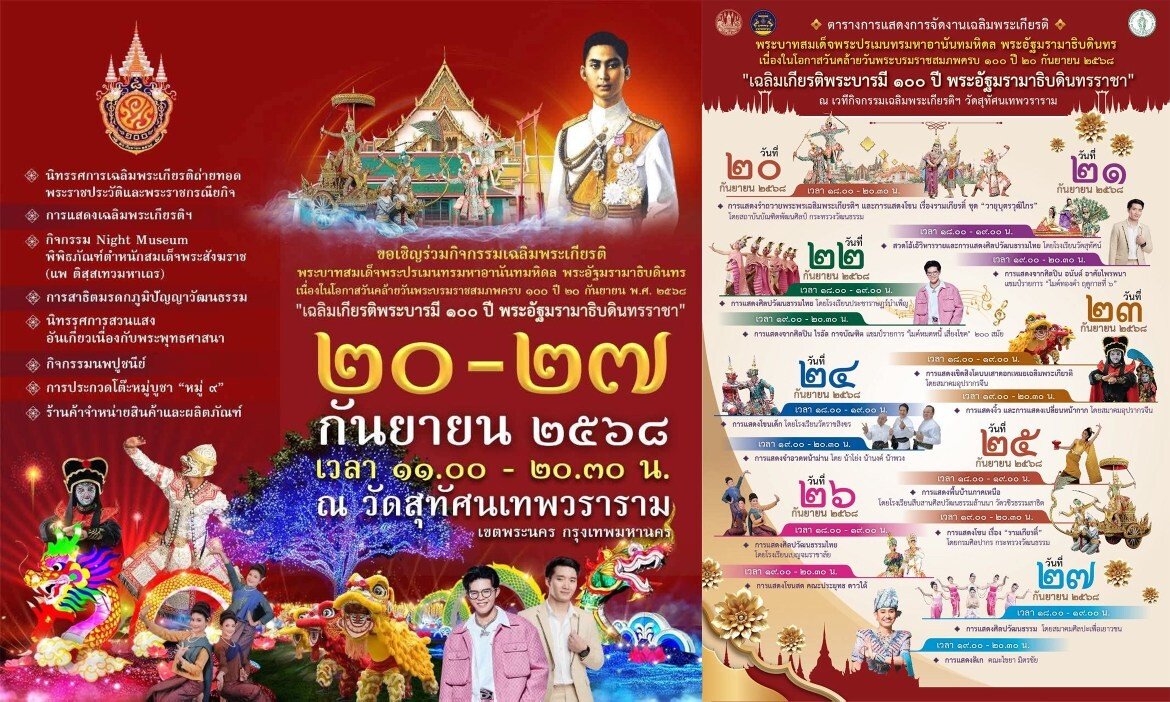 @ กิจกรรม“เฉลิมพระเกียรติพระบารมี ๑๐๐ ปี พระอัฐมรามาธิบดินทรราชา” ระหว่างวันที่ ๒๐-๒๗ กันยายน (๑๑.๐๐-๒๐.๓๐ น.) ณ วัดสุทัศนเทพวรารามราชวรมหาวิหาร ซึ่งประกอบด้วยนิทรรศการ “ยุวกษัตริย์ พระผู้อยู่ในใจไทยตลอดกาล” , การแสดงเฉลิมพระเกียรติฯ , การสาธิตมรดกภูมิปัญญาทางวัฒนธรรม , การแสดงนิทรรศการสวนแสงสีอันเกี่ยวเนื่องกับพุทธศาสนา , การจัดกิจกรรม Night Museum , พิพิธภัณฑ์ตำหนักสมเด็จพระสังฆราช (แพ ติสฺสเทวมหาเถร) ,การจำหน่ายสินค้าและผลิตภัณฑ์ โดยภายในงานจะประดับตกไฟตกแต่งโดยรอบวัด