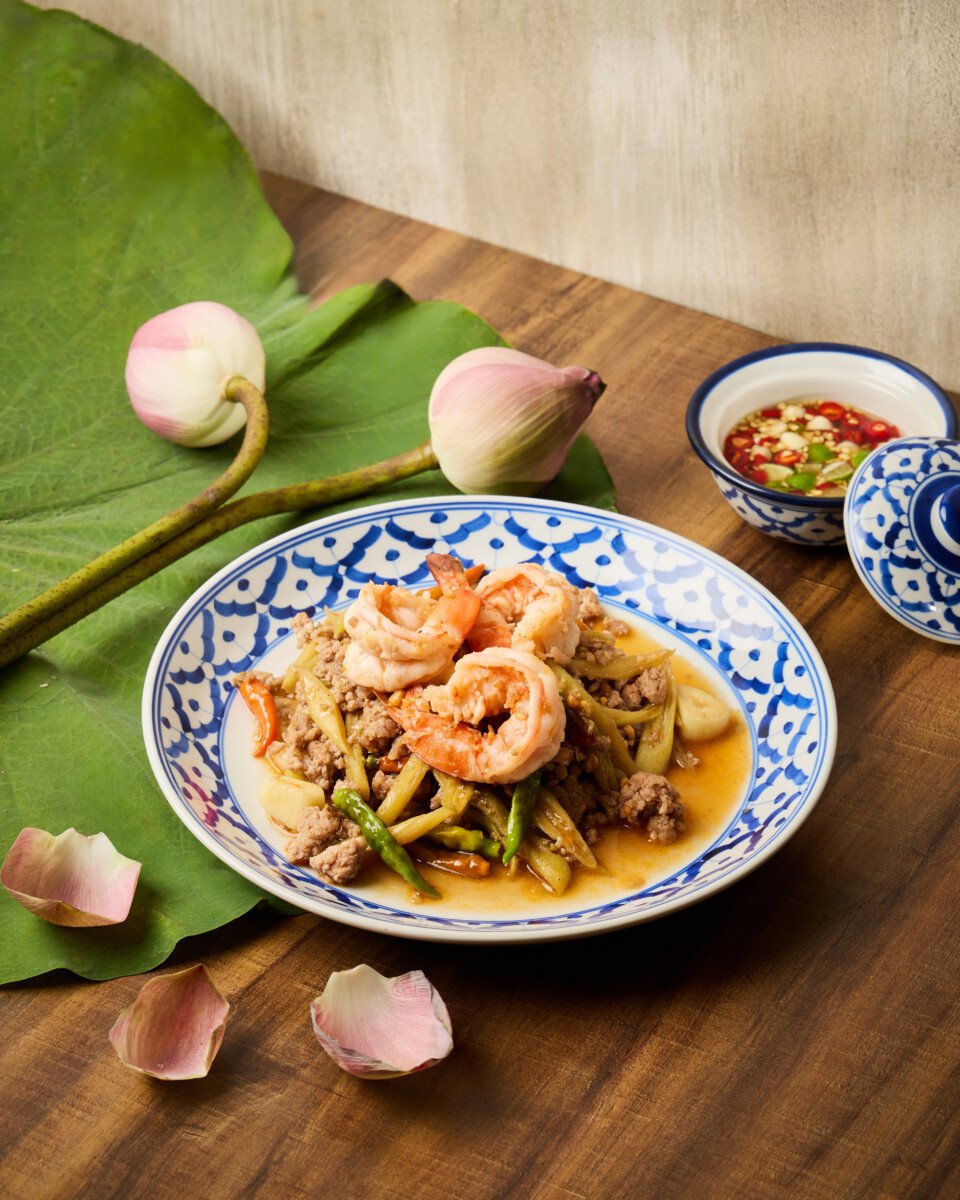 ตำสายบัวกุ้งสดไข่เค็ม : สัมผัสความกรอบนุ่มของสายบัวที่เข้ากันอย่างลงตัวกับความหวานเด้งของกุ้งสด รสชาติจัดจ้าน สดชื่นแบบไทยแท้