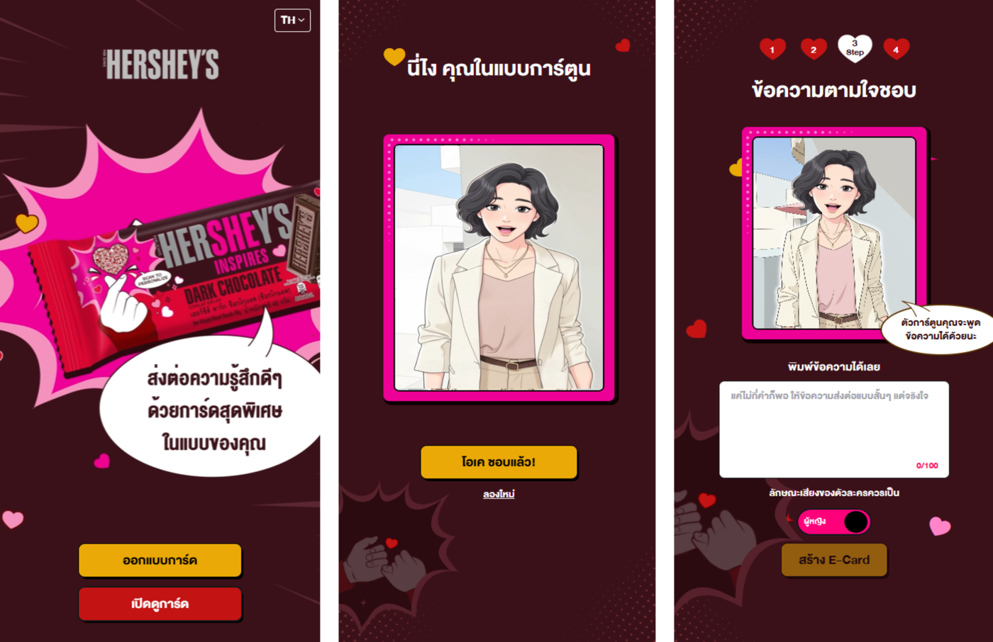 ภายใต้แนวคิด ‘Love for Every Bar’ แพ็คเกจรุ่นลิมิเต็ดอิดิชันของเฮอร์ชีส์ได้กลายเป็นผืนผ้าแคนวาสดิจิทัลเพื่อสื่อความรู้สึกในแบบของตัวเอง ผ่านแพลตฟอร์มดิจิทัลที่ใช้งานง่าย เพียงสแกน QR Code บนแพ็คเกจรุ่นลิมิเต็ด ก็สามารถสร้าง คาแรกเตอร์การ์ตูนเฉพาะตัว ผ่านไมโครไซต์ celebratehershe.com/thเพื่อส่งต่อคำอวยพรจากใจให้ออกมาในรูปแบบแอนิเมชันน่ารัก — พร้อมมอบเป็นของขวัญแทนความรู้สึกให้กับคนพิเศษ