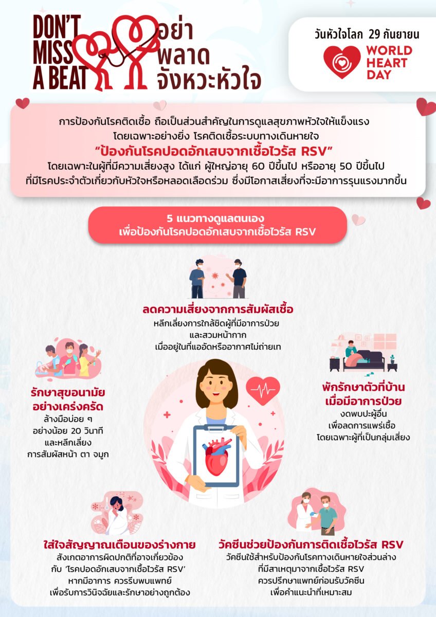 โดยอาร์เอสวีเป็นไวรัสในระบบทางเดินหายใจที่พบได้บ่อยและสามารถป้องกันได้ด้วยวัคซีน ซึ่งอาจเกิดอาการที่รุนแรงมากขึ้นในผู้ที่เป็นโรคหัวใจและหลอดเลือด และในวันหัวใจโลกจึงเป็นการตอกย้ำเพื่อสร้างความตระหนักถึงความเสี่ยงและการดูแลสุขภาพเชิงรุกเพื่อปกป้องสุขภาพหัวใจของทุกคน ให้หัวใจ ไม่พลาดจังหวะ (Don’t Miss a Beat)
