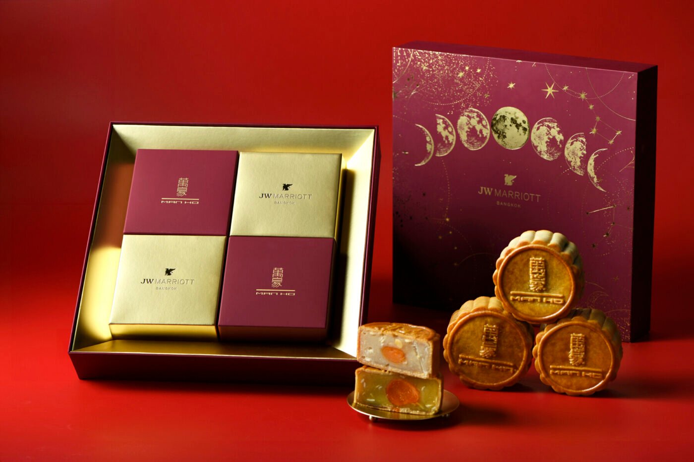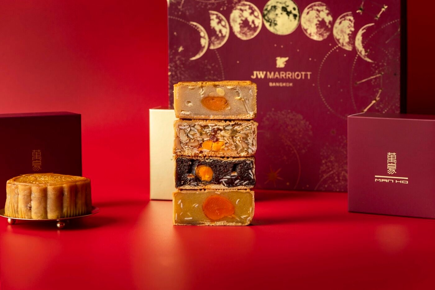 ซึ่งภายในกล่องที่บรรจุรสชาติแห่งความสุขนี้ ได้แบ่งปันความอร่อยผ่านขนมไหว้พระจันทร์ถึง 4 รสชาติ ได้แก่ ไส้ทุเรียนหมอนทองไข่เดี่ยว ไส้ลูกบัวไข่เดี่ยว ไส้โหงวยิ้งไข่เดี่ยว และไส้พุทราจีนไข่เดี่ยว ซึ่งเป็น 4 รสชาติได้ชื่อว่าเป็นตำนานของห้องอาหารจีนมาน โฮ
