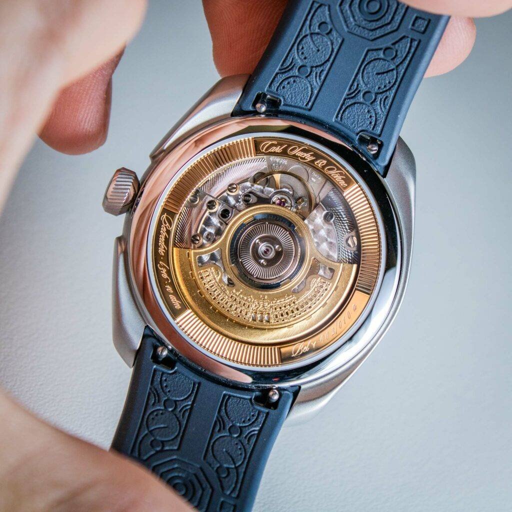 และเมื่อพลิกดูด้านหลังจะเห็นเอกลักษณ์ของรุ่นนี้ ตรงที่โรเตอร์ทองคำได้ถูกแกะสลักรูปพระราชวัง Belvedere ด้วยเทคนิคที่ละเอียดในระดับไมโครแบบงานศิลปะอย่างแท้จริง ในส่วนของสายนาฬิกาก็ยังมีลวดลายพิเศษ โดยลายบนสายนั้นได้รับแรงบันดาลใจมาจากตราประจำราชวงศ์ออสเตรีย เพื่อสื่อถึงต้นกำเนิดความเป็นมาของตระกูล
