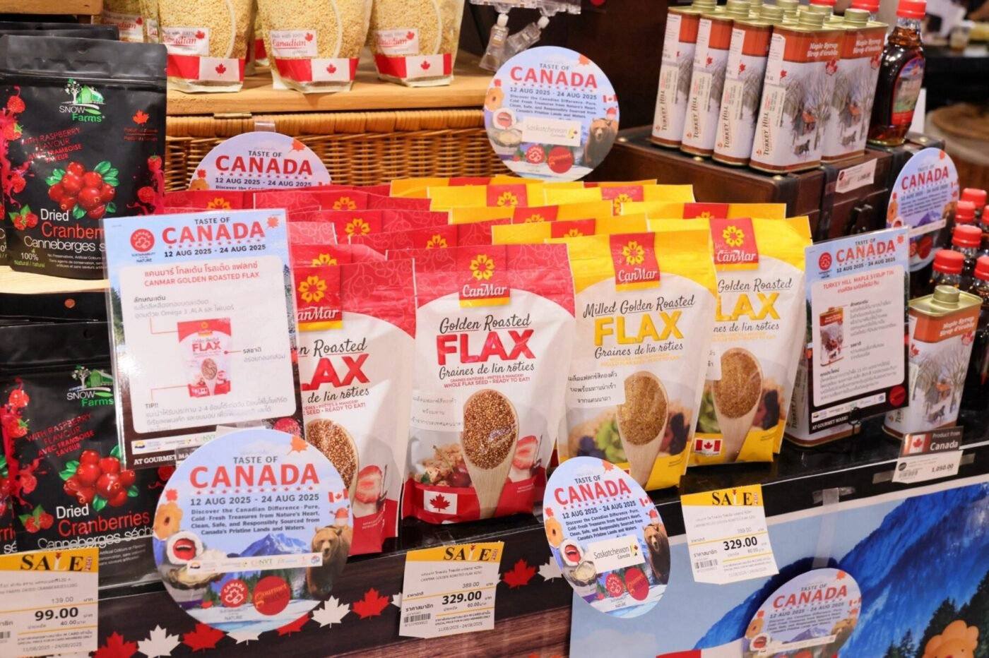 นอกจากนี้ยังมีสินค้าคุณภาพสูงจากแคนาดามาให้เลือกสรรอีกหลายรายการ อาทิ ปลาแซลมอนซ็อกอาย, หอยนางรมสดแคนาดา, กุ้งล็อบสเตอร์ยักษ์, เชอร์รี่สีทอง, บลูเบอร์รี่, น้ำแร่จากภูเขาน้ำแข็งดีเอ็มเบริ์ก ไอซ์เบริ์ก เพียววอเตอร์, แครนเบอร์รี่และราสพ์เบอร์รี่อบแห้ง สโนว์ ฟาร์ม, เมล็กแฟล็กซ์ แคนมาร์ มิล, เทอคีฮิล เมเปิลไซรัป, โพสท์ ซีเล็กต์ ซีเรียลอบกรอบผสมบลูเบอร์รี่ เป็นต้น และยังมีเมนูอร่อยจากแคนาดาให้เลือกลิ้มลองทั้ง ปูตีน (Poutine) จากร้าน Bad Poutine, กาแฟพรีเมียมและโดนัท จาก Tim Hortons